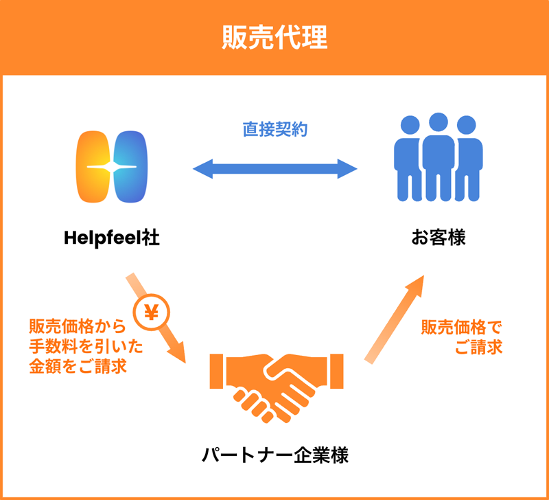 販売活動まで担っていただくパートナープランです。営業活動はパートナー様にて行い、契約はHelpfeel社とお客様の間で締結されます。