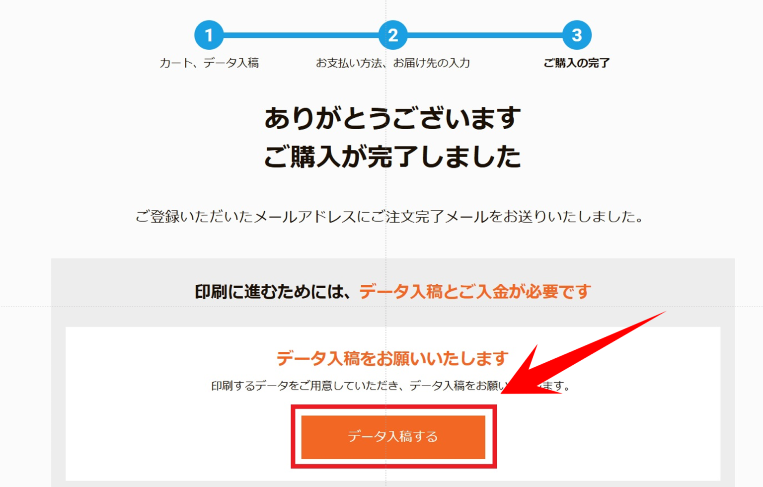 ※「データ入稿」のボタンが表示されない場合は、データを入稿したいけど、マイページで「データ入稿」のボタンがないをご確認ください。